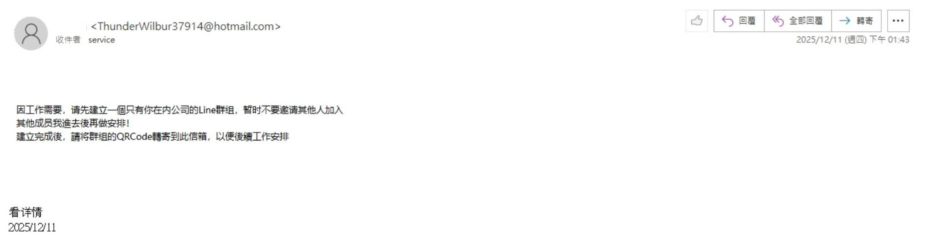詐騙者假冒公司高層,寄出內容看似正常、內容帶有「急迫指示」的Email或訊息,要求收件人建立 LINE 群組並回傳 QR Code。只要照做,詐騙集團就能順勢進入群組,進一步佯裝主管交辦緊急財務任務,藉此誘導匯款或要求代墊費用。
