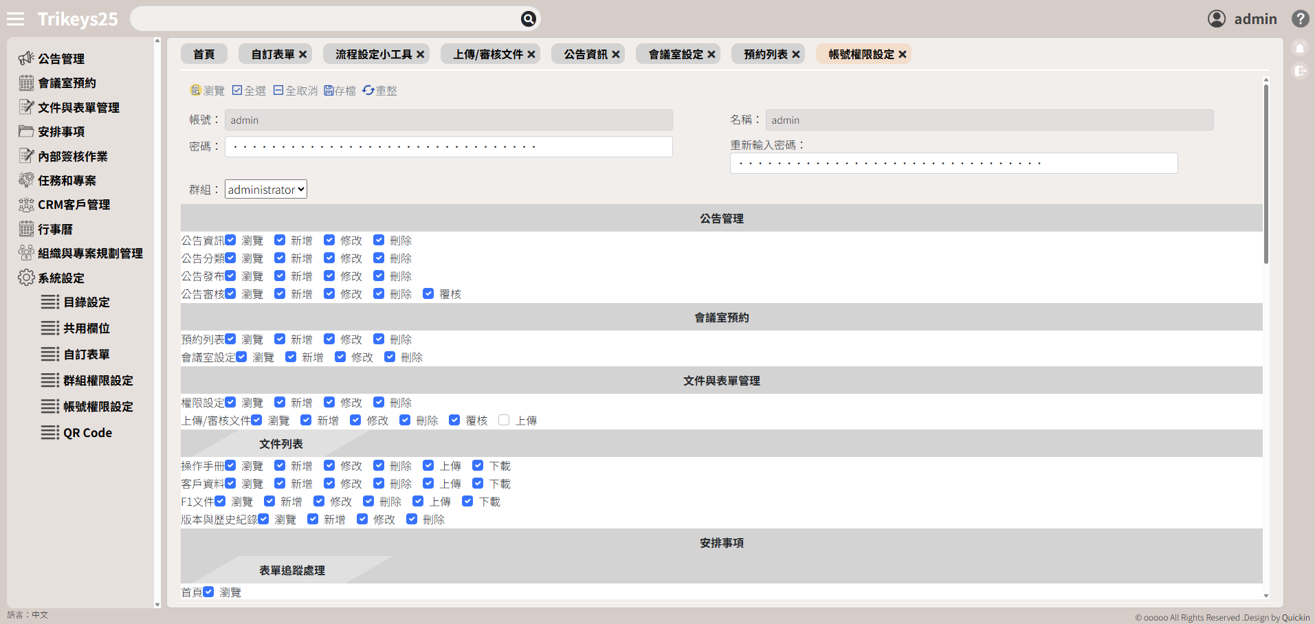 1.根據公司內部各層級職位,設定不同的操作權限,例如:查看、簽核、修改、管理。
