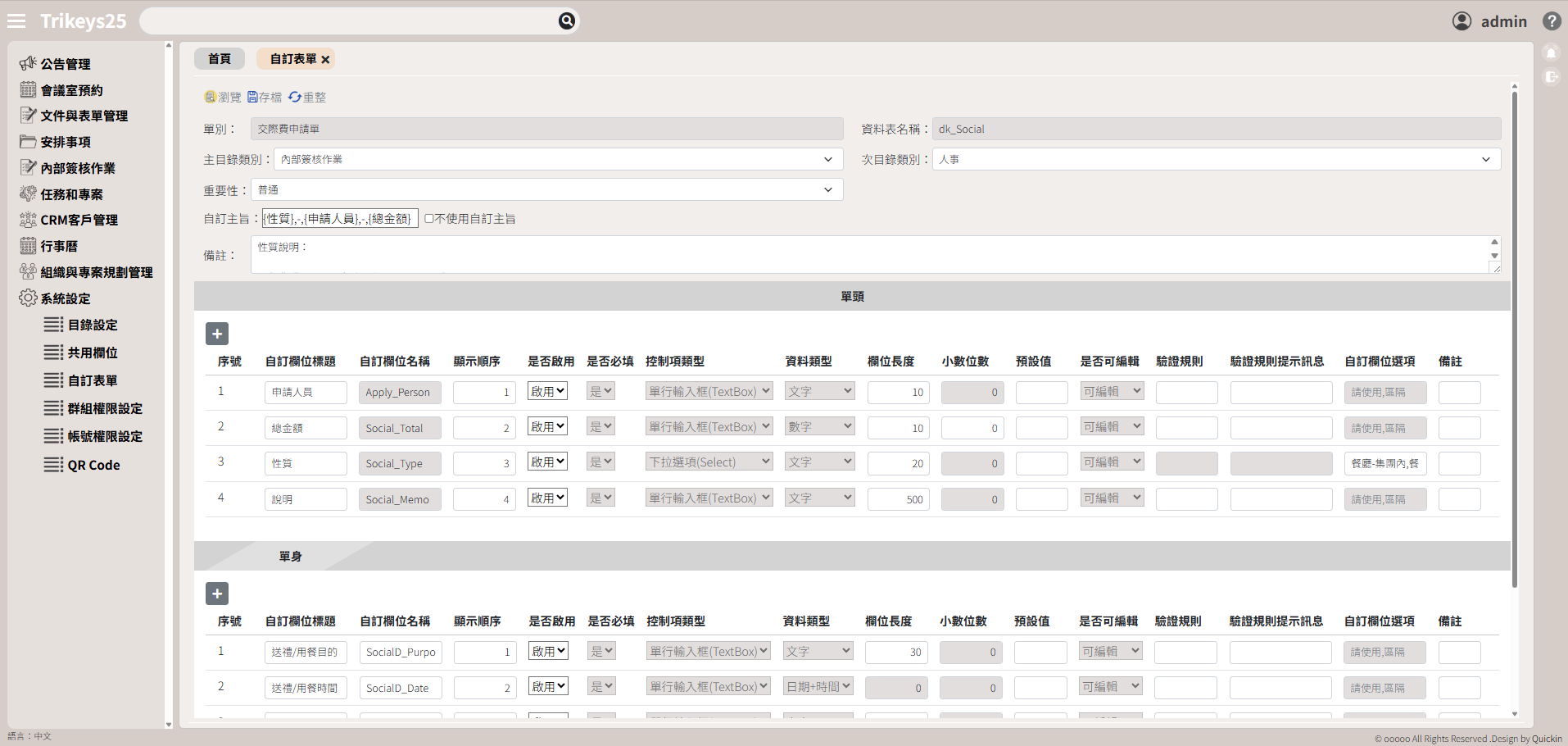 2.支援單據的單頭及單身欄位自定義,由您自行去調整申請人須填寫哪些內容,亦可設定【共用欄位】,讓您更快速的完成單據欄位設定。