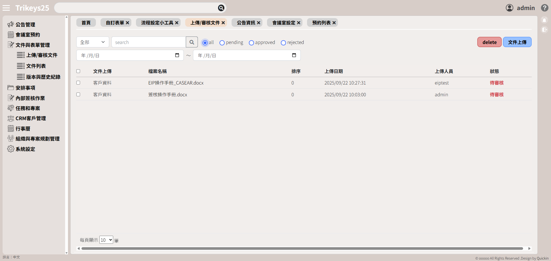 1.文件上傳後須經過審核流程,可在審核時設定瀏覽對象及決定是否更新版號。
